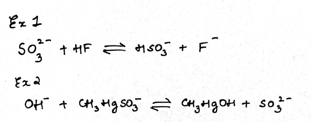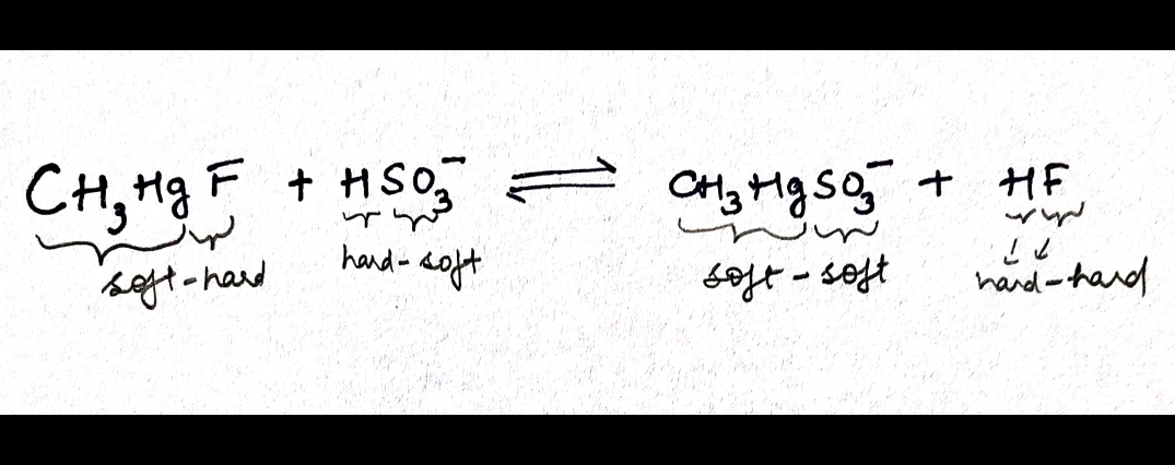 In example 2 ,the strong hard base OH- interacts with soft acid methylmercury cation to displace a weaker soft base sulfite ion.
