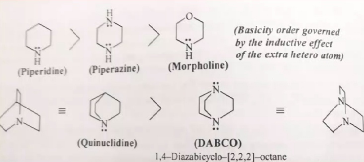 morpholine and DABCO is the least basis due to the presence of a more electronegative oxygen and nitrogen respectively which are essentially EWGs here.