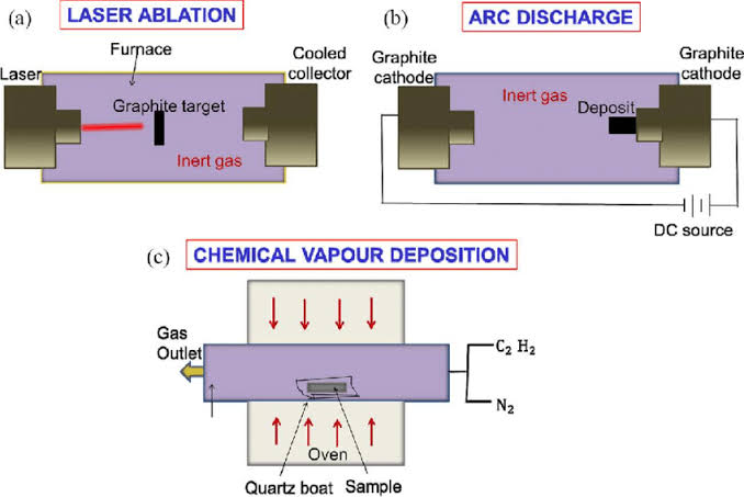 In this method the graphite target is subjected to laser and the sublimed carbon is recollected all of these occurs in an inert gas atmosphere,at controlled temp.