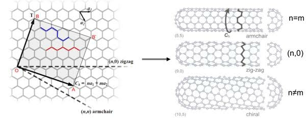 Based on how the graphene sheet is wrapped the single walled nanotube in represented by a pair of indices (n,m) where n and m denote the unit vectors along two directions in the honeycomb crystal lattice of graphene as shown below