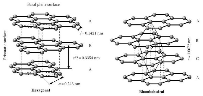 In hexagonal form layers are stacked in ABAB pattern such that the C atoms of the alternate layers are vertically above on the other hand in the rhombohedral form the layers are stacked in ABCABC fashion.